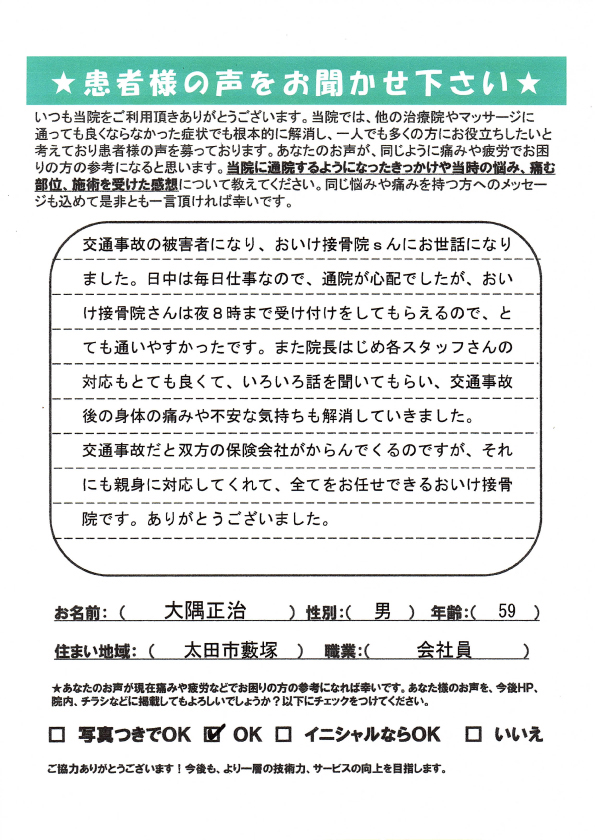 首の痛みと肩こりが長く続き、以前から知人に評判を聞いていたおいけ接骨院に行ってみようと思いました。ネットで“肩こり 太田市”で調べても1番上に出てきました。ホームページもとても充実していて色々な事が分かりやすく説明されていました。
