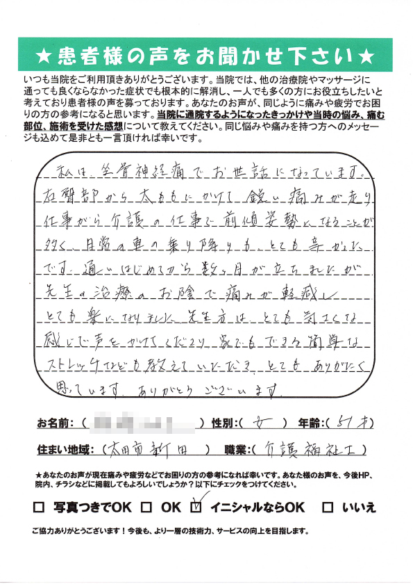 治療計画も立てていただき、根本的に治療をしていただく事により、回数を重ねる度に血液の循環がよくなり痛みやこりが軽減されていきました。今後はケアの意味も込めて定期的に通わせていただきたいと思います。