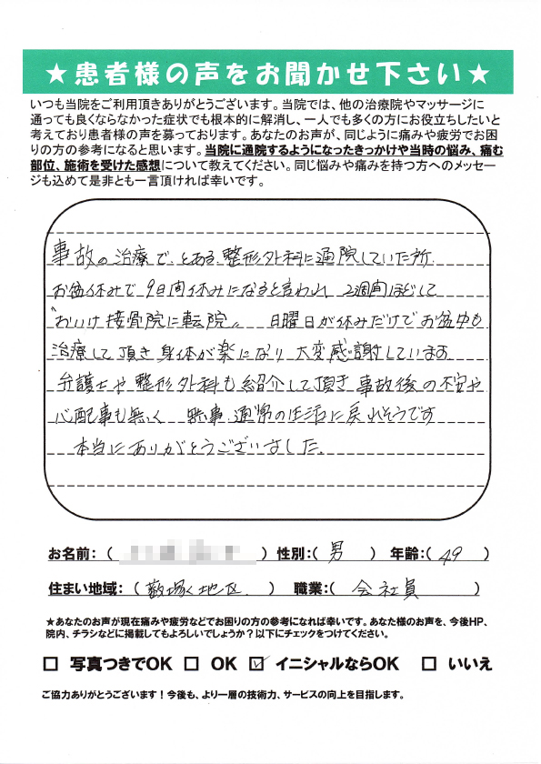 近所の方がまっすぐなきれいな姿勢で歩かれていましたので呼び止めてお話を聞いた所「おいけ接骨院」に通っていると伺いました。