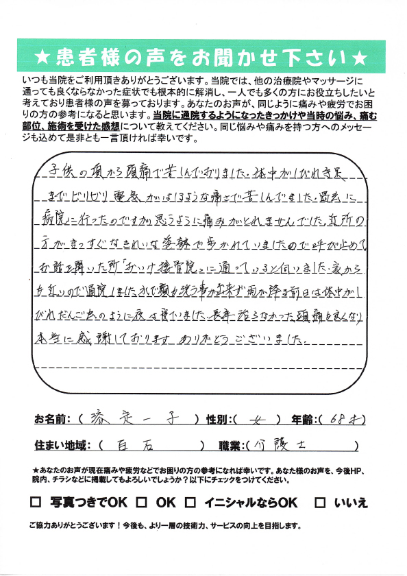 長年治らなかった頭痛も良くなり本当に感謝しております。ありがとうございました。